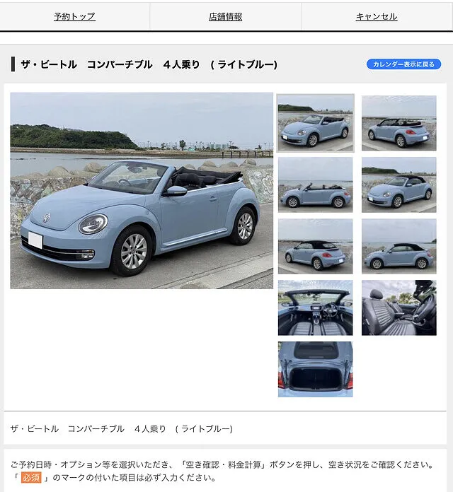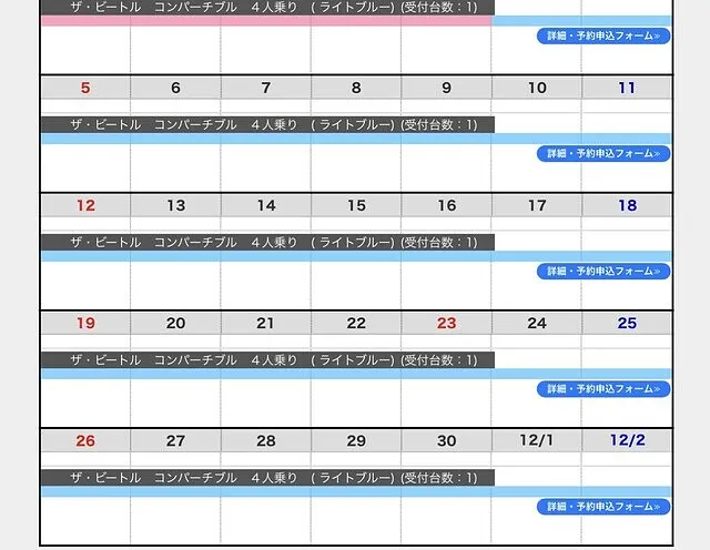 予約ページよりレンタルする日程をカレンダーで選択していただき、「詳細、予約フォーム」をクリックすると、その期間中にかかる料金を確認することができます。
